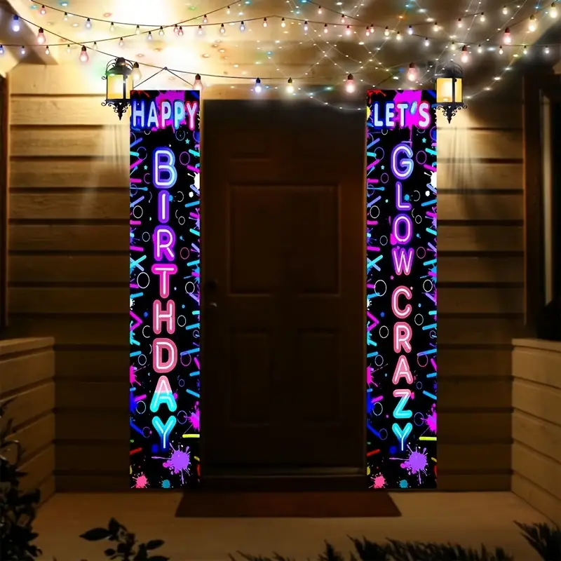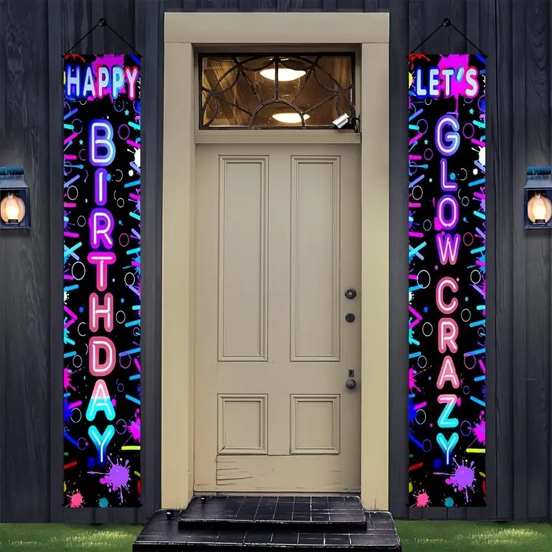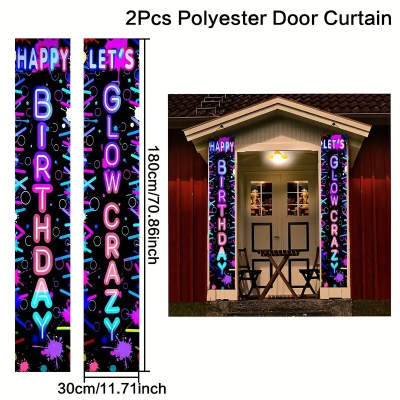 Fluorescent Party Happy Birthday Door Curtain, Luminous Light Neon Party Supplies, Let’s Glow Crazy Fluorescence Flags, 70.87 * 11.81inch Polyester Door Hanging Banner