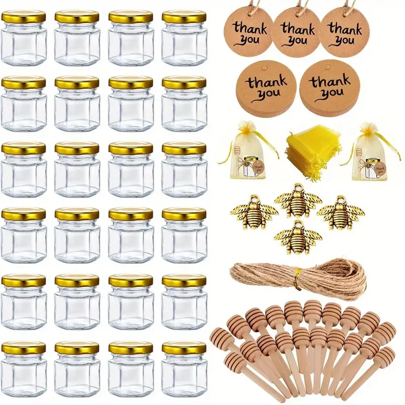 101-Piece Glass Honey Jars with Dipper – Golden Lids, Bee Pendants, Jutes, and Thank You Cards – Perfect for Baby Shower Favors, Wedding Favors, Party Favors