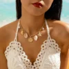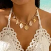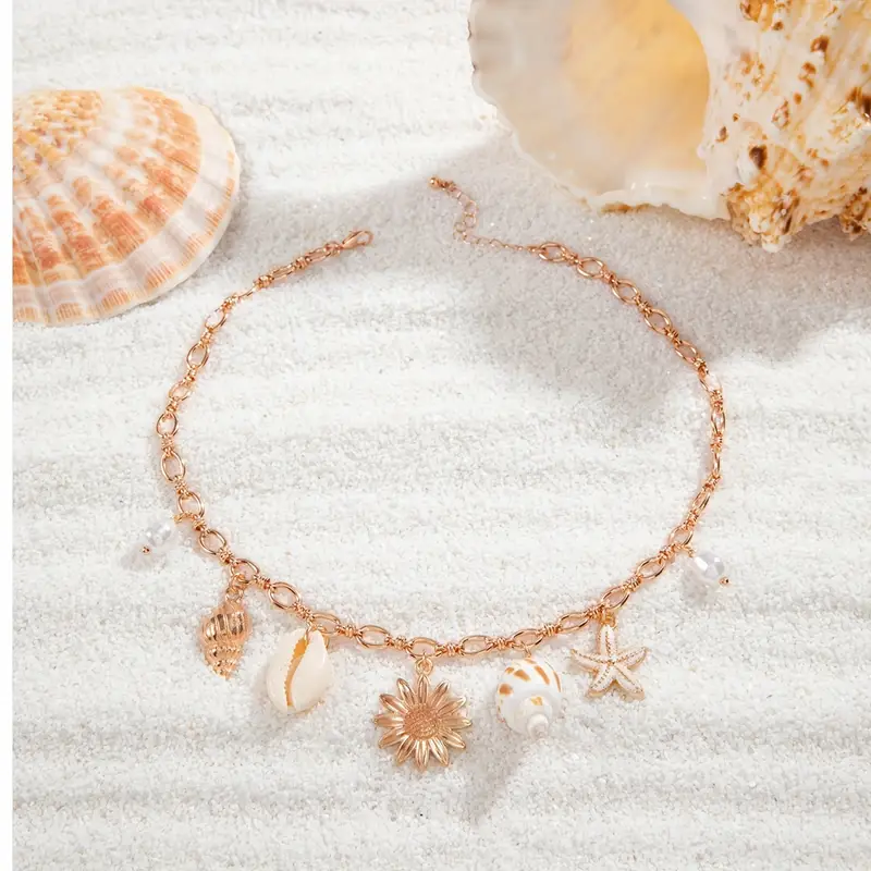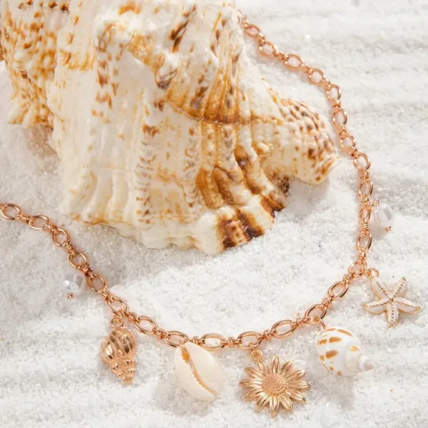 Boho Vacation Style Sunflower & Sea Life Charm Pendant Necklace – UV Plated Iron Chain with Shell Accents, Perfect for Beach Holidays and Summer Parties